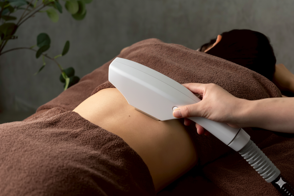 太ももとお腹のハンドマッサージ。その後、専用機器(メディセル)を使い太もも・お腹・陰部のケア