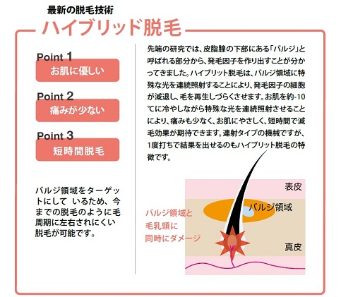 ハイブリット脱毛 方式:特殊波長でバルジ領域とメラニンを作用させる。 一度の照射でバルジ領域と毛包部に攻撃を行う事でお肌に優しく痛みが少ない。 そして従来のSHRとは違い往復する必要がないので時短にも期待で出来ます。 レディース、メンズ、キッズモード、患者様に合わせて施術が可能です。 さらに、ヒゲやデリケートゾーンなど多彩な機能をお使いいただけます。また肌質や毛質の状態に配慮した施術を行えます。